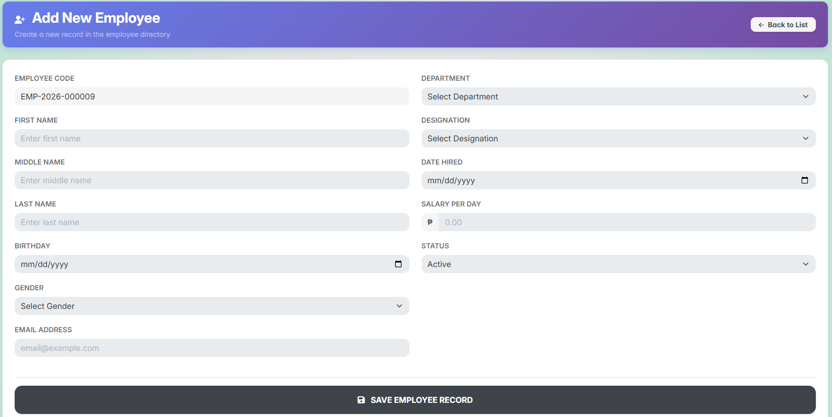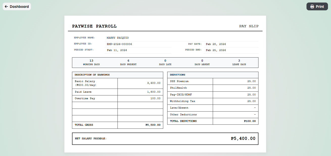 Generate clock in and clock out, leave credits, earnings, deductions, and payslip